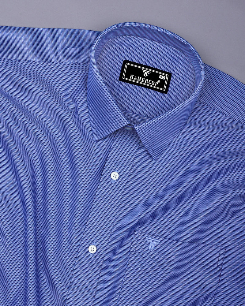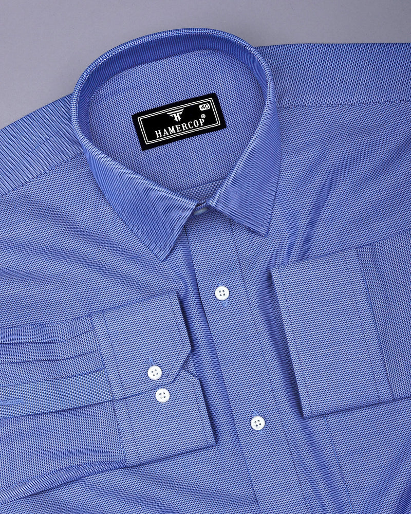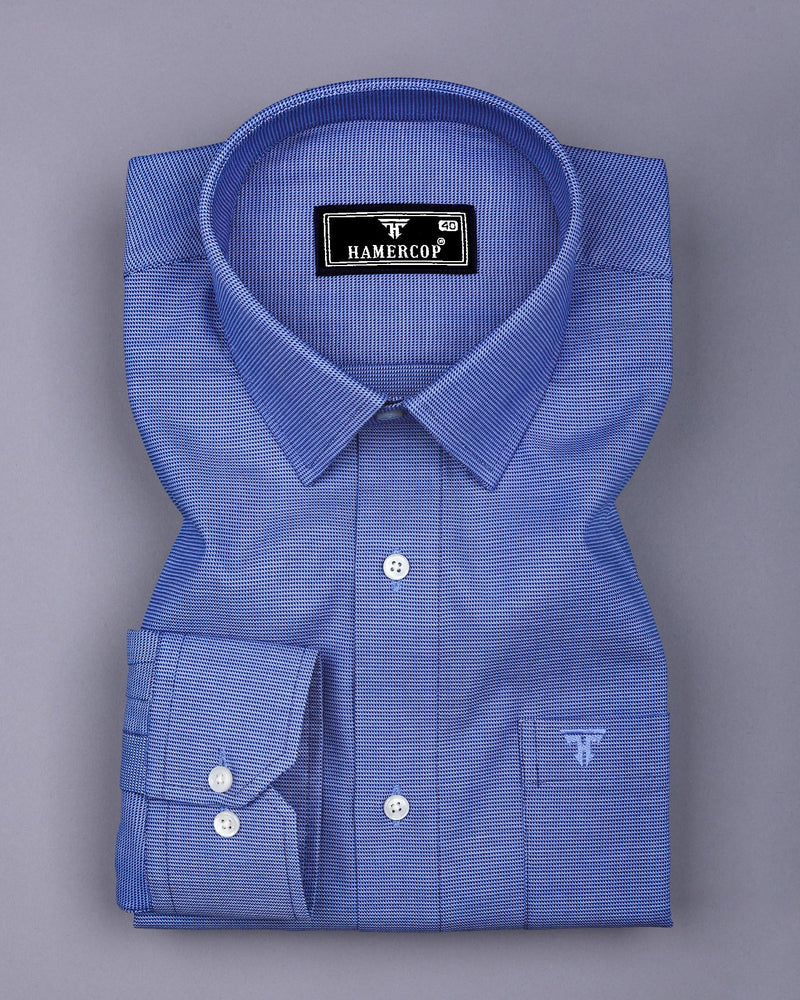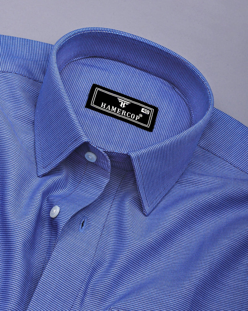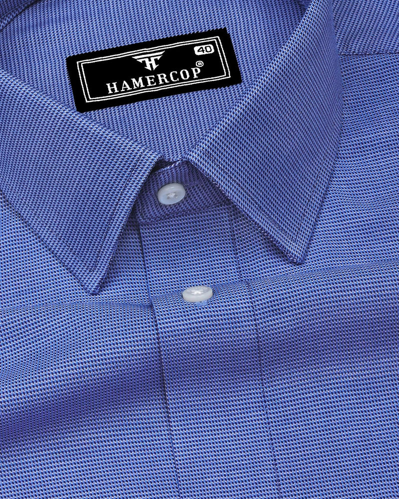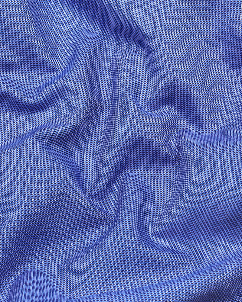 Immerse yourself in shirts that redefine sophistication for the contemporary man. This blue cotton shirt features a subtle white dobby texture, adding a sophisticated and stylish touch to a classic design. The fine, woven pattern creates a tactile visual interest, making it stand out from a regular shirt. Crafted from soft, breathable cotton, this shirt ensures comfort throughout the day. The rich blue hue pairs well with a variety of outfits, making it versatile for semi-formal occasions.